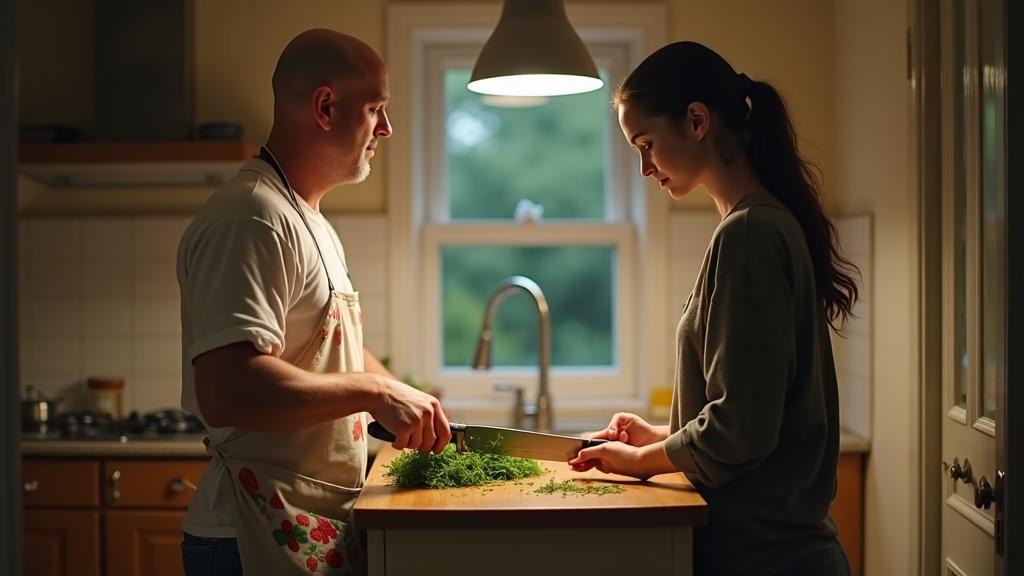Под мягким светом потолочной лампы, у небольшого шкафчика, скромно устроился мужчина лет сорока с залысинами. Он уверенно и почти мастерски шинковал укроп широким ножом Ярины.