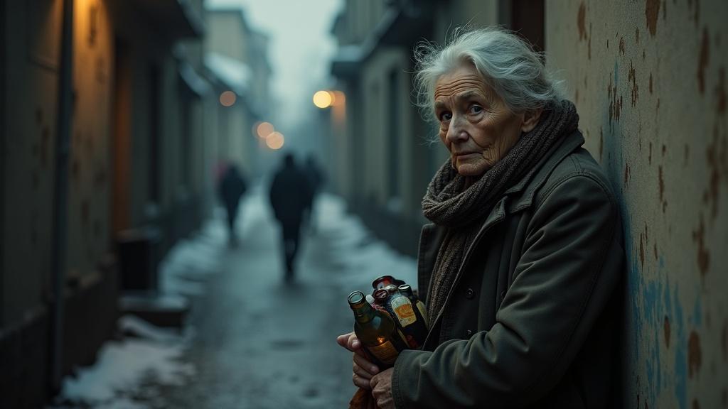 Леденящий зимний ветер пронизывал до самых костей, завывая в узких переулках, словно напоминая о тех временах, когда здесь ещё жили люди с открытыми душами и добрым сердцем. У облупившейся стены под выцветшей вывеской стояла старушка — лицо её было испещрено морщинами, каждая из которых будто хранила воспоминания о боли, стойкости и несбывшихся мечтах. В руках она крепко держала поношенную сумку с пустыми бутылками — остатками от прежней жизни. Из глаз текли слёзы, застывая на щеках от мороза.
