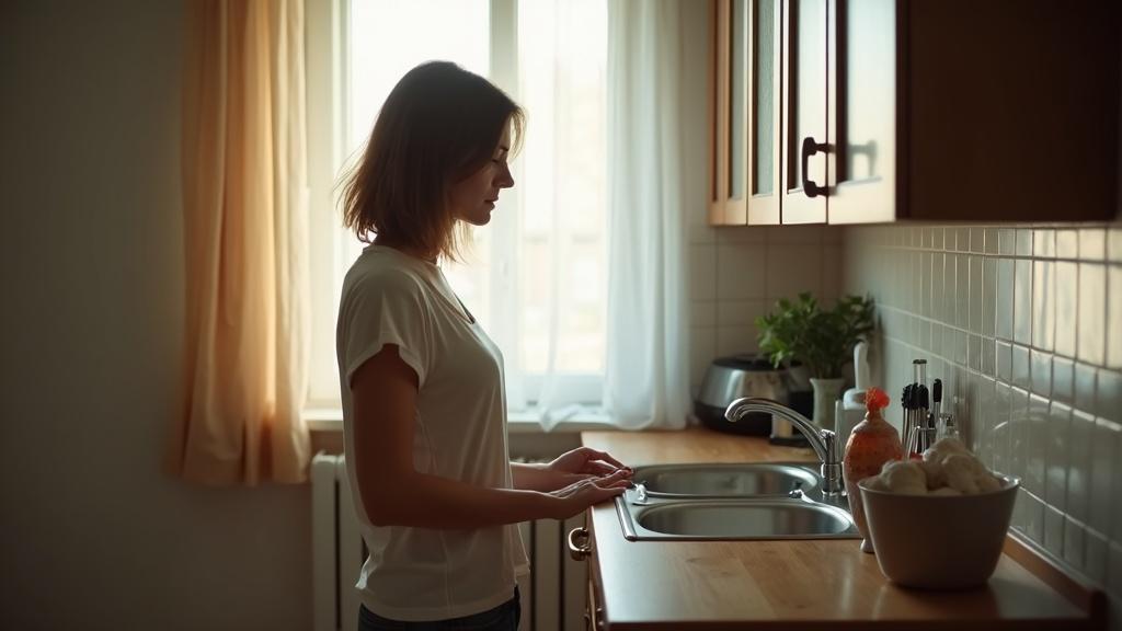В ванной она быстро привела себя в порядок, оделась и направилась на кухню. Посуда со вчерашнего ужина всё ещё стояла в раковине — тарелки с засохшими остатками еды, кастрюля и сковорода. Оксана нахмурилась. Она просила Богдана вымыть посуду вечером, но он сослался на усталость после работы и ушёл смотреть футбол.
