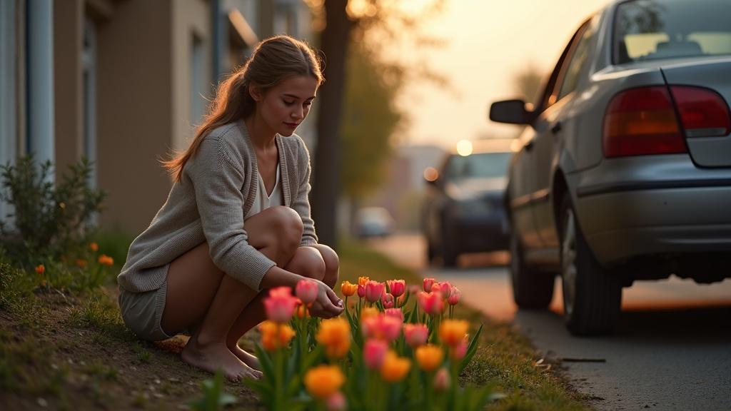 Однако не все ценили усилия Оксаны. Особенно Андрей — тот самый сосед из другого подъезда. И вот сейчас он аккуратно загонял свой автомобиль прямо на клумбу с тюльпанами, которые девушка так старательно высаживала.