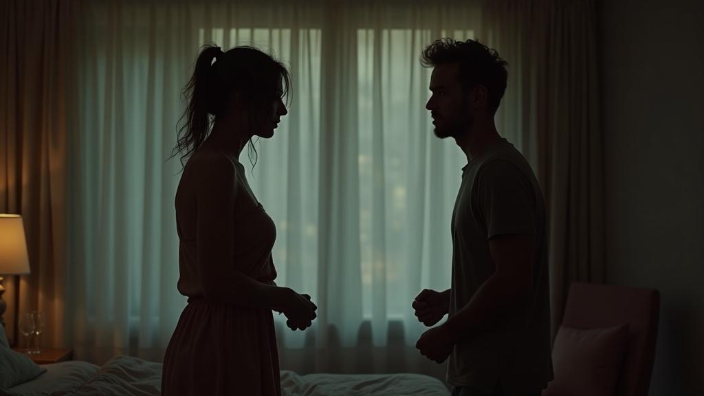 В просторной спальне с огромными окнами царил полумрак — лишь слабое свечение уличных фонарей пробивалось сквозь полупрозрачные занавеси, отбрасывая на стены причудливые тени.