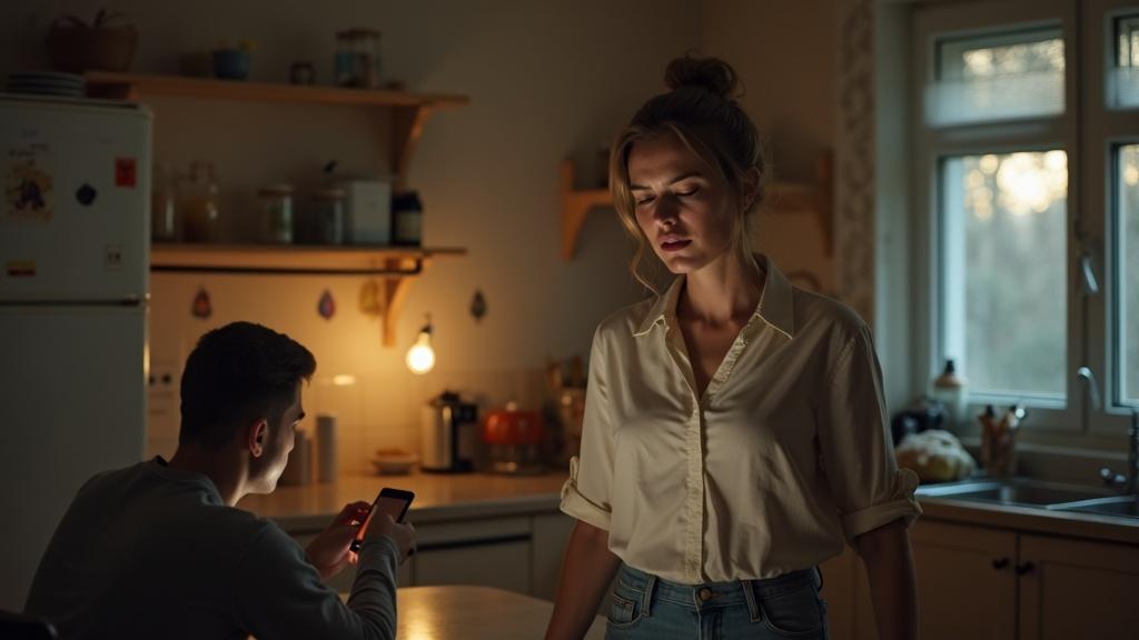 Дарина вернулась домой после утомительного рабочего дня. Максим сидел за кухонным столом, не отрываясь от экрана телефона. Его лицо было напряжённым, брови сдвинуты — явно что-то случилось.
