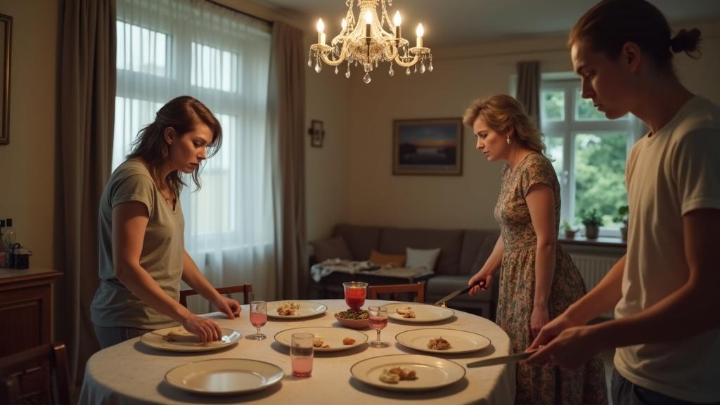 Богдан, нарезавший хлеб на кухне, сжал нож так крепко, будто собирался его переломить. Жена подошла к нему, слегка коснулась плеча и покачала головой — молча напоминая: не стоит. Он шумно вдохнул и кивнул в ответ, но напряжение в его фигуре осталось.