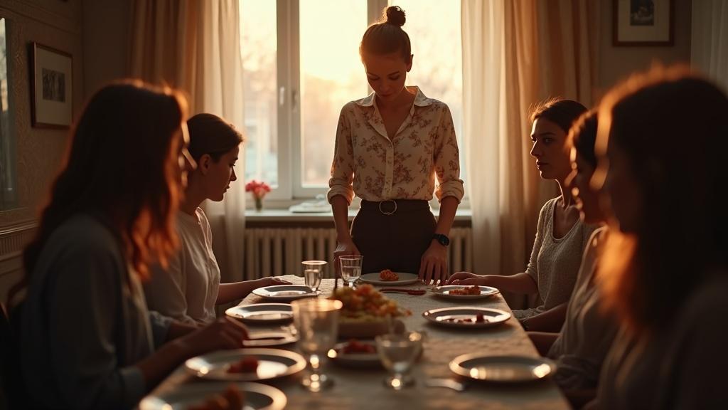 Оксана, державшая в руках стопку чистых тарелок у серванта, застыла на месте. Внутри у неё всё сжалось в тугой комок. Сегодня был юбилей её мужа — Александру исполнилось сорок. Она готовилась к этому дню две недели: продумывала меню до мелочей, закупала продукты на рынке, выбирая только лучшее и свежее, мариновала мясо по особому рецепту, который выпросила у шеф-повара на корпоративе. Вчера она провела у плиты семь часов подряд — ни минуты не присев — чтобы всё получилось идеально. И вот гости только расселись за столом, даже первый тост ещё не прозвучал, а Лариса уже начала свою привычную критику.