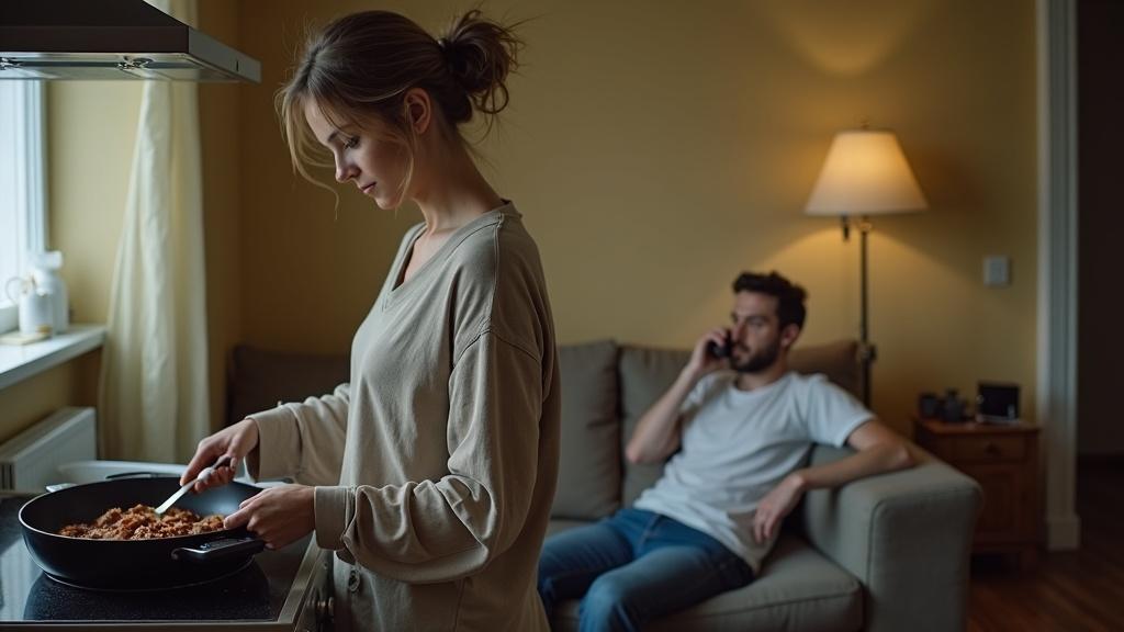 В это время Оксана находилась на кухне у плиты: мясо шкворчало на сковороде, а она сосредоточенно следила за процессом.