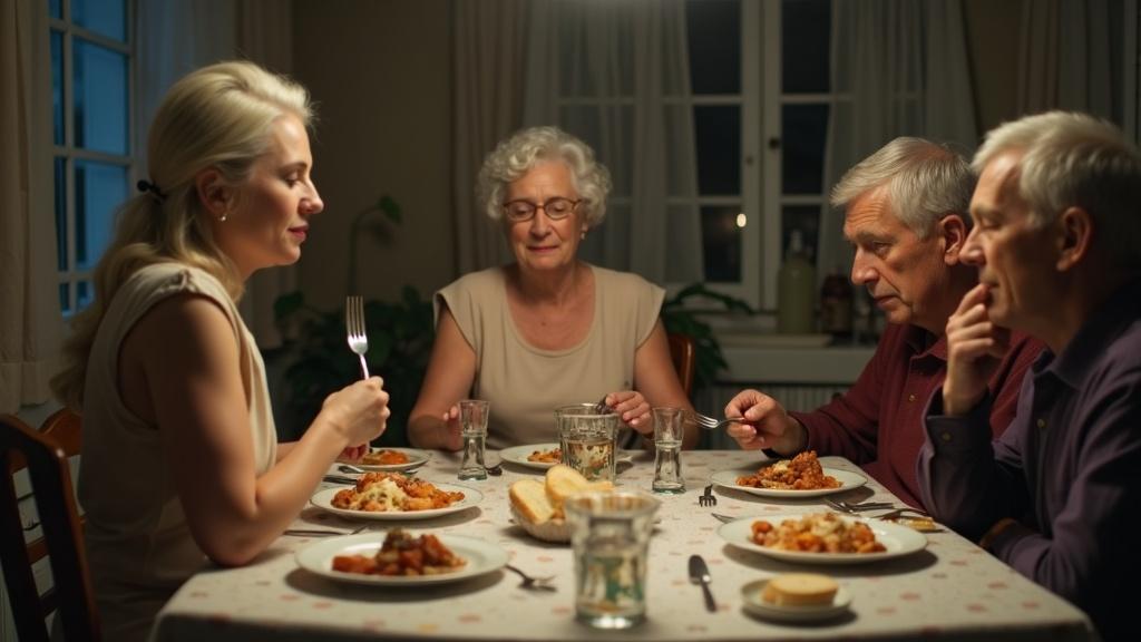 Оксана с силой бросила вилку в тарелку — звон металла эхом прокатился по кухне. Валентина вздрогнула, её ложка задела край супницы, и густой соус брызнул на белоснежную скатерть.