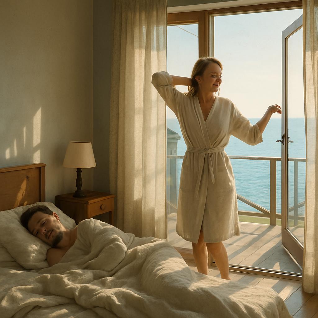 Море в то утро было удивительно тихим, когда Мария проснулась от мягкого плеска волн за окном. Солнце уже поднялось и, пробиваясь сквозь полупрозрачные занавески, рассыпало по деревянному полу тёплые золотистые блики. В воздухе стоял запах соли и свежести — и ещё чего-то неуловимого, похожего на ощущение свободы. Она сладко потянулась, улыбнулась и повернулась на бок — рядом крепко спал Иван.