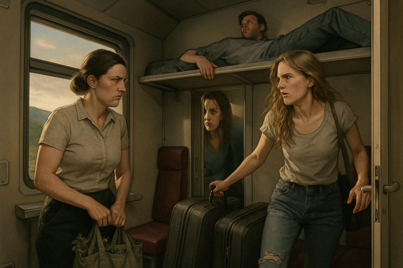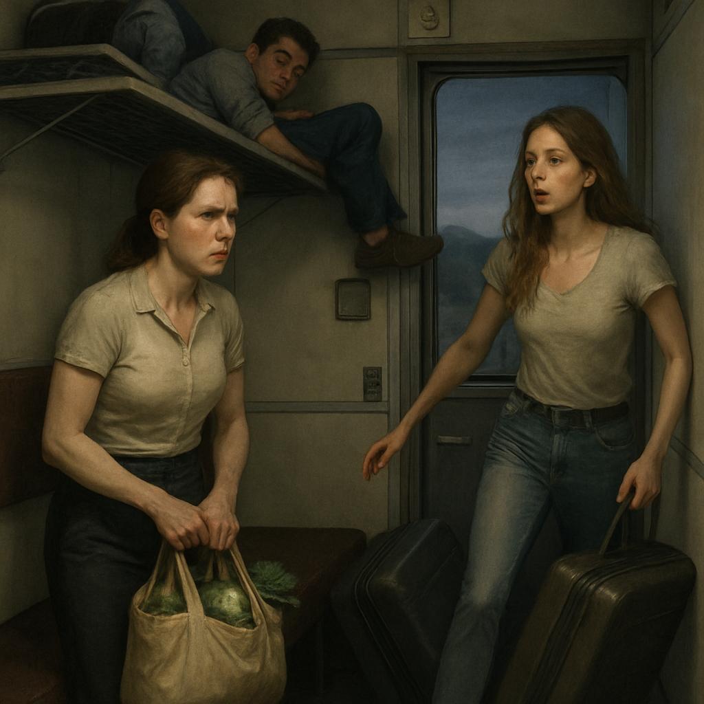 Не прошло и пяти минут, как дверь купе распахнулась так резко, что пластиковая панель жалобно звякнула. На пороге возникла Анастасия, младшая сестра Дмитрия, окружённая тремя огромными чемоданами, словно крепостными стенами.