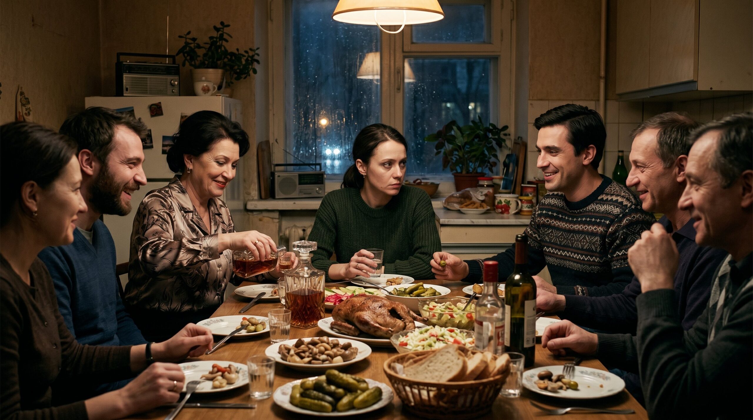 Аромат запечённой утки, смешанный с пряным запахом маринованных грибов, висел в комнате плотной завесой. Стекло звенело о стекло, гости перекрикивали друг друга, смех вспыхивал то тут, то там — типичный субботний сбор у свекрови. Галина Павловна, торжественно разливая коньяк по рюмкам, буквально светилась от удовольствия. Её праздник, её дом, её правила.