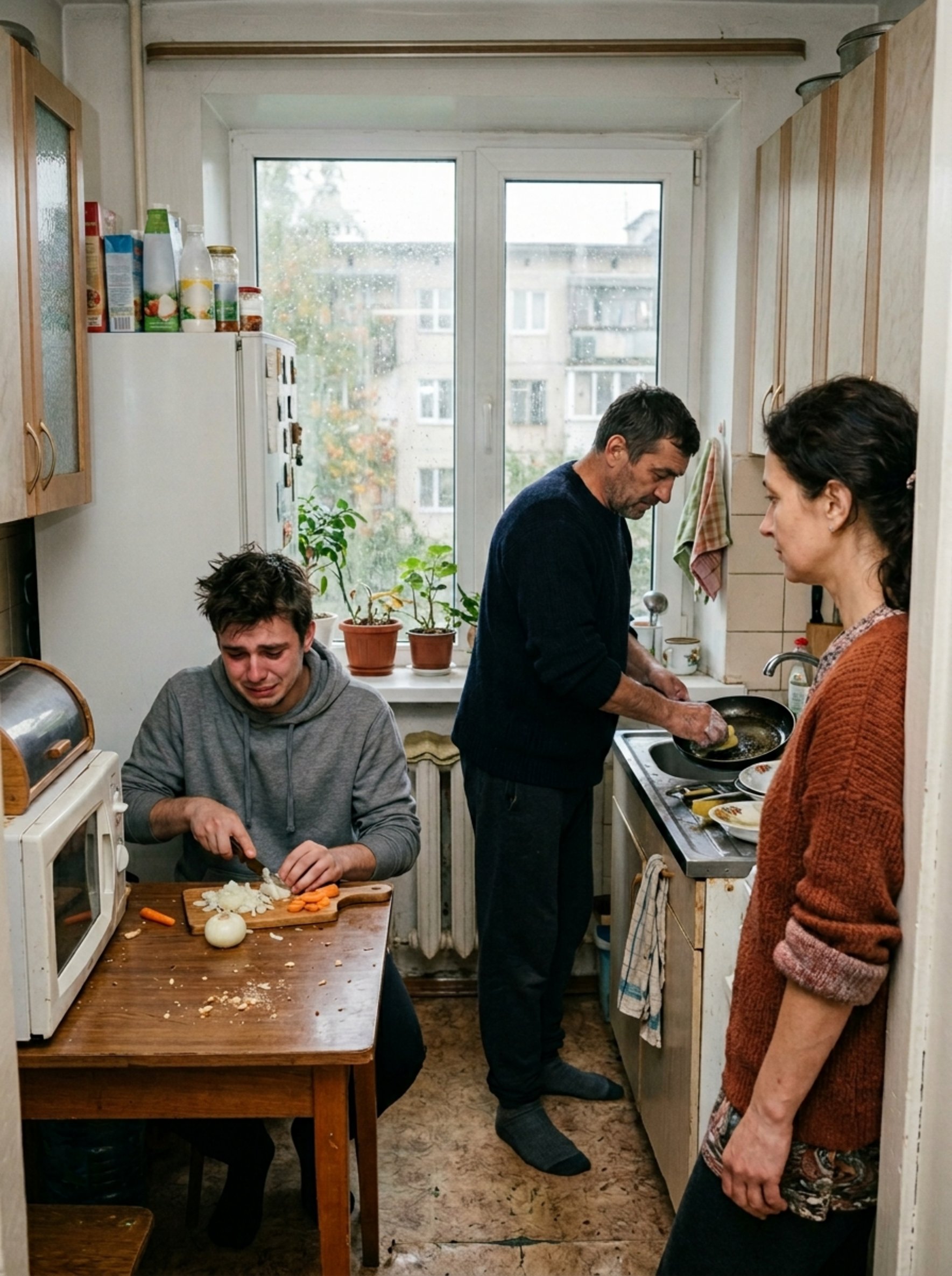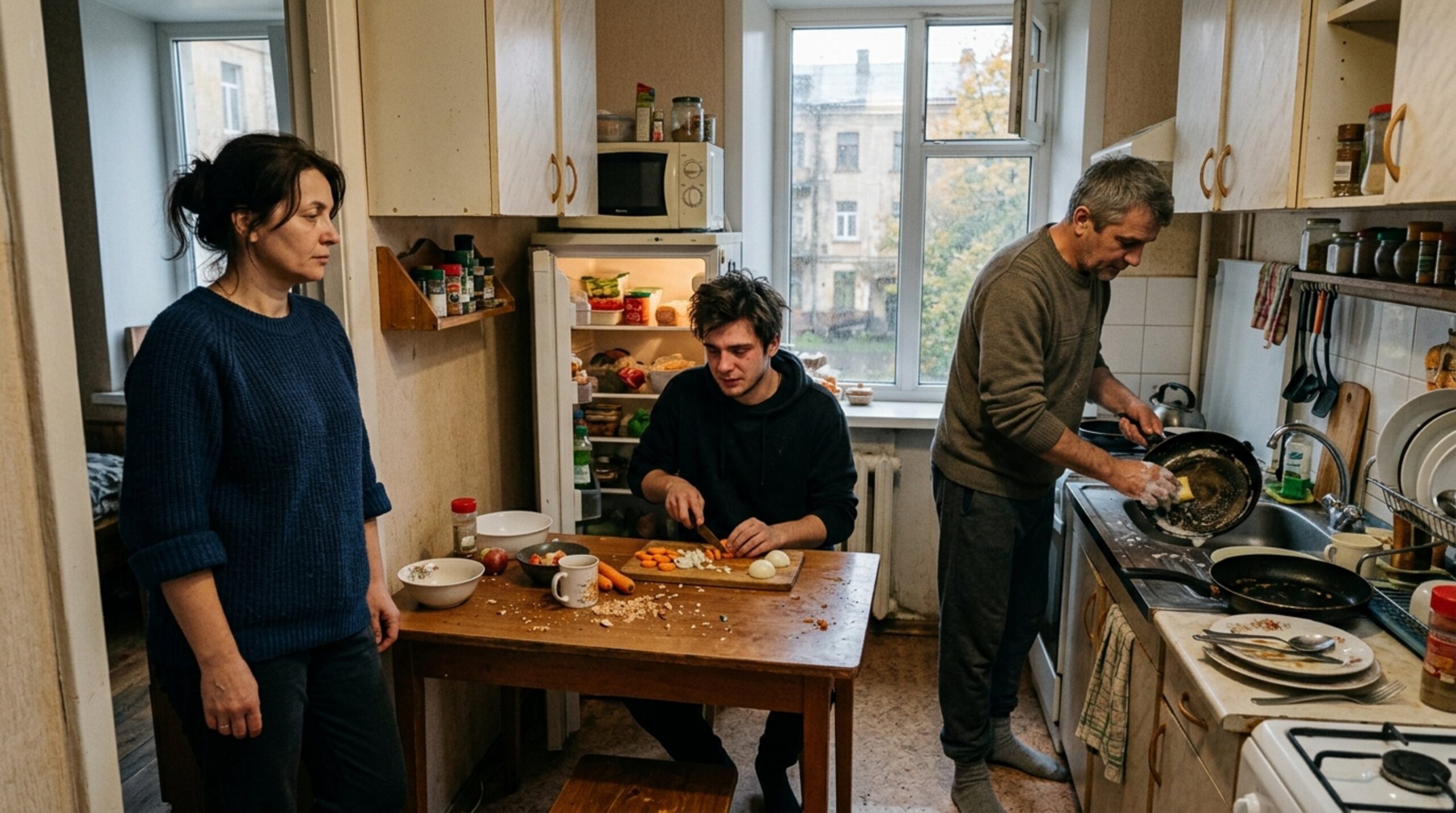 Недовольный голос донёсся из кухни — Сергей говорил, даже не прикрыв дверцу холодильника. За столом развалился Максим, двадцатипятилетний сын, уткнувшийся в экран телефона. Он лениво пролистывал новости и даже не потрудился поднять глаза, словно ужин должен был возникнуть сам собой, по щелчку пальцев.