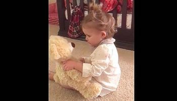 Маленькая девочка получает в Подарок плюшевого медведя. Смотрите на ее реакцию,когда она нажимает на лапу игрушки