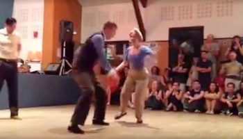 Он хватает ее за руку и начинает танцевать. Смотрите на человека в белой рубашке позади них…
