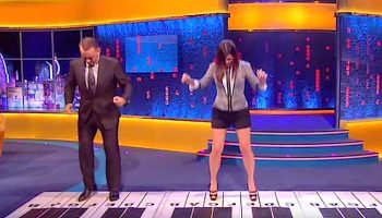 Том Хэнкс шагает по напольному фортепиано. Когда к нему присоединяется помощница — смотрите на ее ноги!