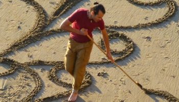 Человек использует грабли на пляже для создания великолепных произведений искусства