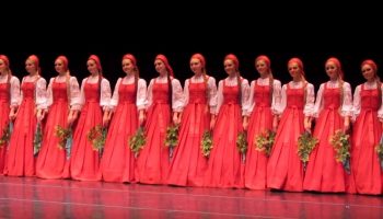 16 красивых девушек, одетых в красные сарафаны, двигаются по сцене так, что зрители не могут оторвать взгляд