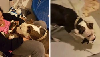 Женщина была шокирована, когда спасенная ею питбульша положила ей на колени 11 новорожденных щенков