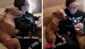 Женщина забирает питбуля из приюта для собак, и тот в благодарнрость постоянно обнимает новую хозяйку