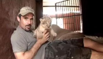 Львица лежит с новорожденным детенышем. В это время человек пытается взять на руки малыша