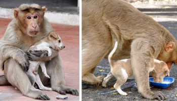 Обезьяна подбирает щенка, принимает его, как своего детеныша и защищает от бездомных собак