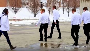 Она идет по улице. Смотрите внимательно на людей в белом!