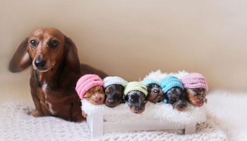 Прелестная такса позирует со своими 6 щенками для семейной фотосессии