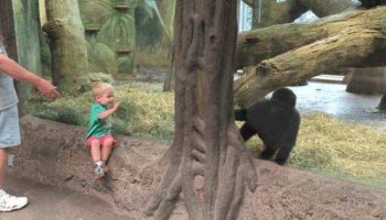 Малыш бежит смотреть на молодую гориллу. Никто не ожидал, что они вдвоем начнут играть в прятки