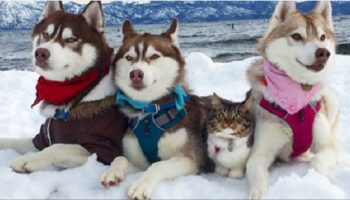 3 хаски стали лучшими друзьями кошке, после того, как спасли ее от смерти