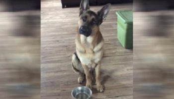 Немецкая овчарка выпрашивает еду, а владелец за это ее нахваливает