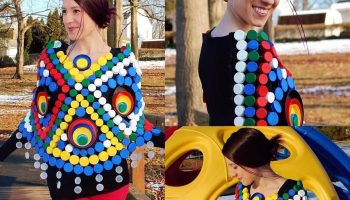 Я использовала более 250 пластиковых колпачков, чтобы сшить это красочное пончо
