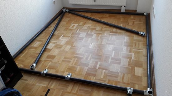 Следующим шагом было построить второй каркас из труб под потолком. Это сделало кровать более прочной и позже это будет покрыто балдахином, чтобы придать сооружению красивый законченный вид.