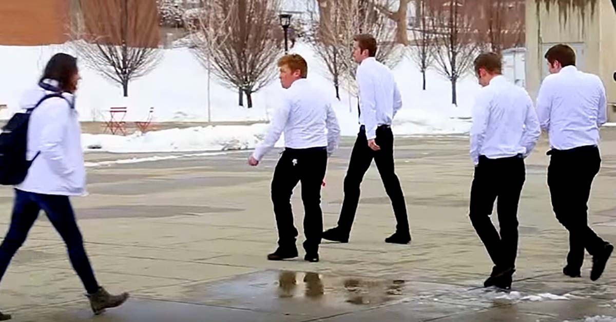 Эти пять человек знают идеальный способ отметить День Святого Валентина. Собрались несколько друзей, чтобы преподнести дамам веселую песню-сюрприз в день Валентина, такую, которую никогда не слышали раньше. парни оделись в чисто белые рубашки и черные галстуки, и с розами в руках они вышли в случайные места в поисках дам. Когда мужчины увидели одинокую девушку, они крались позади нее, чтобы удивить ее песней о любви. Женская реакция бесценна!