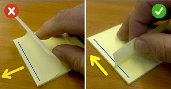 Если вы срываете липкие заметки снизу, край свертывается и блок будет расклеиваться со временем. Чтобы избежать этого, оторвите лист вдоль клейкой части.