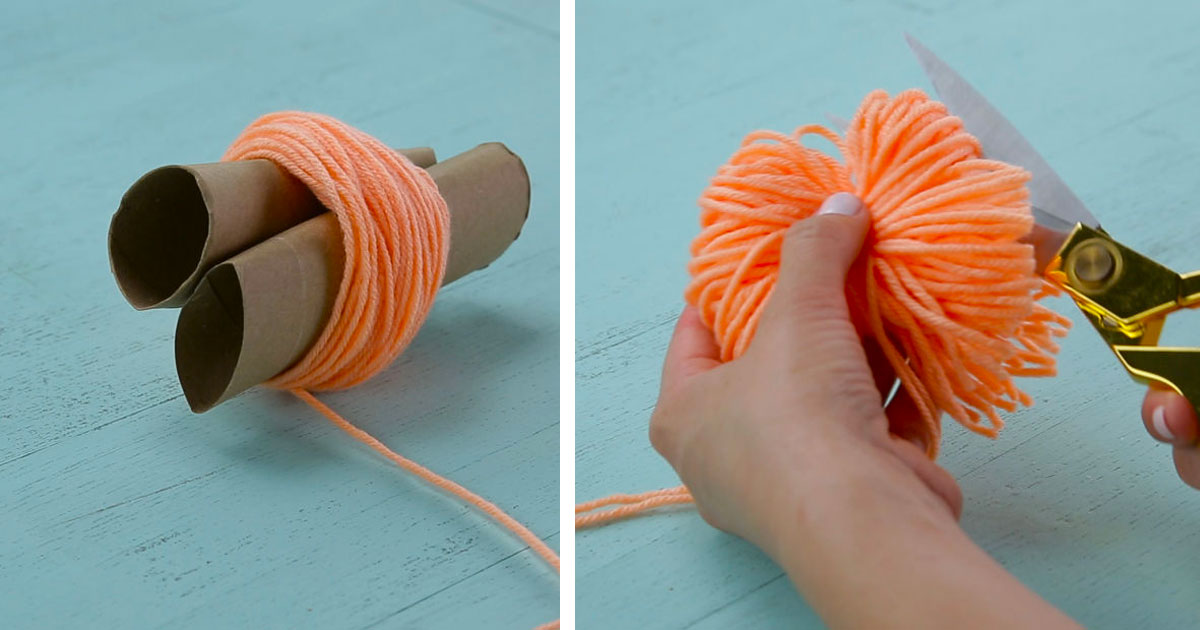 Шаг 4.) Отрежьте кусок пряжи и свяжите им намотанные нити. Взбейте ваш помпон и повторите этот процесс, чтобы создать достаточно помпонов для коврика нужного размера.