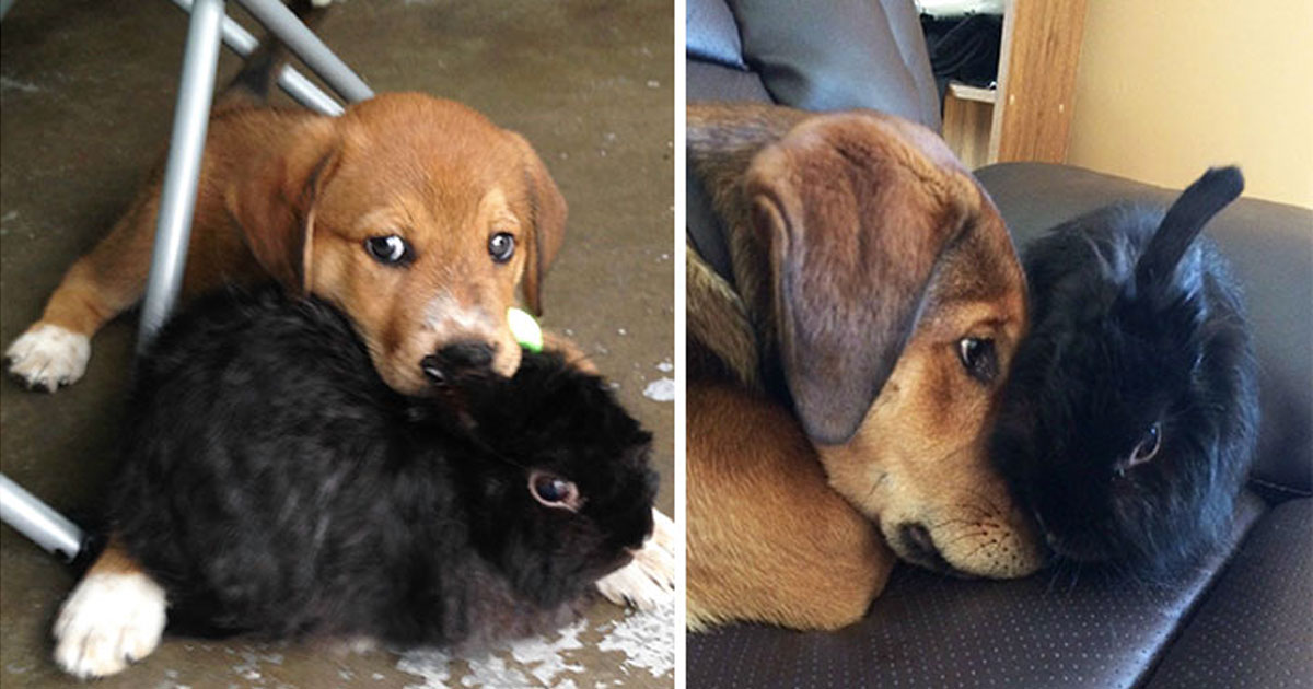 Когда этот щенок встретил своего пушистого друга кролика, он очень защищал его.