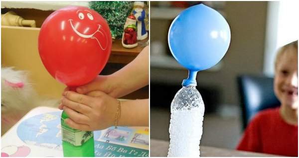 - Надень шарик на горлышко бутылки. В результате взаимодействия соды и уксуса выделяется углекислый газ, который, как известно, тяжелее воздуха. Заполненный углекислым газом шарик не сможет подняться вверх.