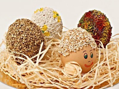 4. Наибольшее удовольствие ребятишкам доставит рисование забавной мордашки на неоклеенной части яйца.