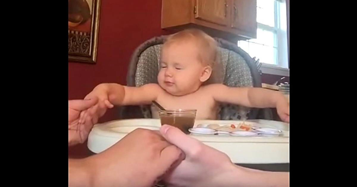 Маленькая девочка в видео ниже сидит за обеденным столом с мамой и папой. Когда папа говорит, что это то время, когда нужно молиться, просто посмотрите, как ребенок реагирует! Она сразу же протягивает свои маленькие ручки, чтобы взяться за маму и папу. Затем она закрывает глаза и внимательно прислушивается к молитве, которую собирается произнести отец. Это так мило!
