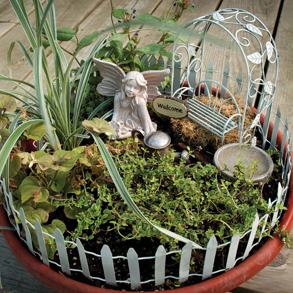 Отличным дополнением такой композиции станет миниатюрная мебель, посуда, фонари, скамейки или парковые скульптуры, которые имеются в детских наборах.