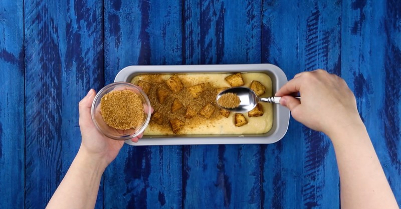 Теперь вылейте оставшуюся часть теста в форму и поместите оставшиеся кубики яблок сверху. Смешайте последнюю чайную ложку корицы и коричневого сахара, затем посыпьте яблоками.