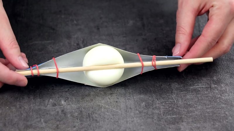 Этот трюк требует немного подготовки, но оно того стоит. Вырежьте кусок картона из-под пакета молока или найдите что-то подобное. Согните картон в середине, а затем положите туда теплое крутое яйцо. Далее положите деревянную палочку на яйцо и прижмите вниз, чтобы сформировать складку в яйце. Зафиксируйте это резинками и ждите, пока яйцо не остынет.