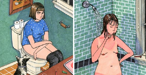 Женщины на иллюстрациях Салли Никсон делают свои повседневные вещи: принимают душ, едят в постели, чистят зубы, ходят по дому без штанов, и лениво проводят время возле телевизора со своими друзьями. Другими словами — действия женщин, когда на них никто не смотрит.