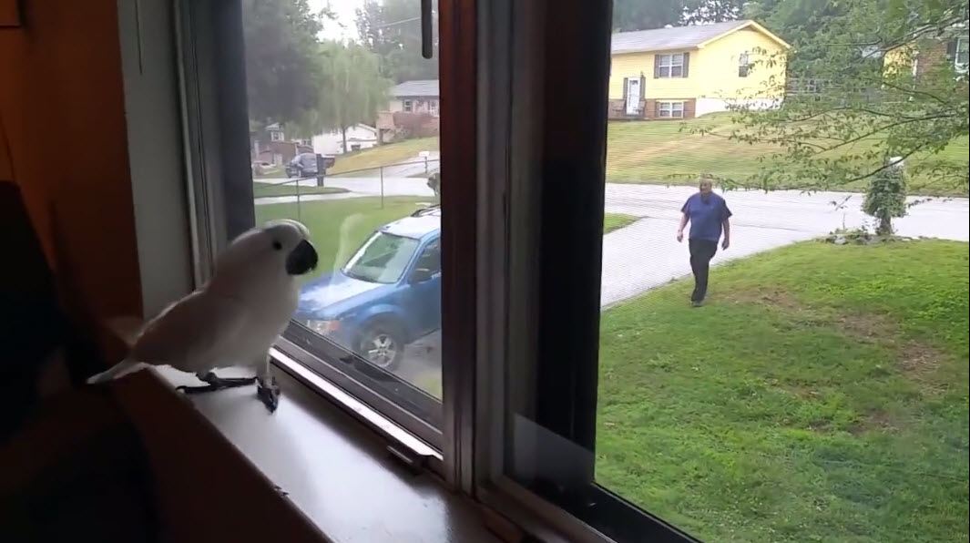 Какаду Онни сидит на окне, и когда замечает своего владельца, идущего уже по двору, в тот самый момент попугай удивительно радуется.