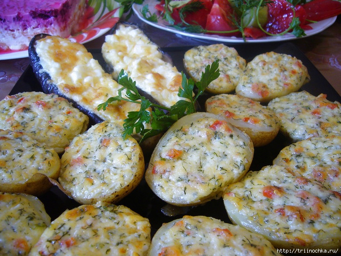 -Намазываем на каждую картошину чесночную начинку и ставим в разогретую до 250 г духовку.