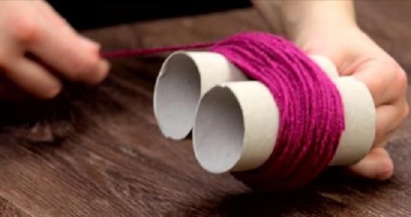 Выберите из пряжи в цвета, которые вы хотите для вашего готового ковра. Возьмите два пустых рулона туалетной бумаги, положите их рядом друг с другом, и наматывайте пряжу вокруг них обоих.
