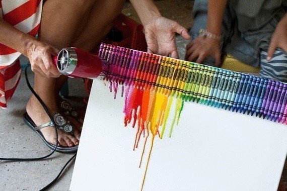 3. Когда клей высохнет убедитесь, что карандаши прочно держатся на холсте.Теперь нужно поставить холст вертикально и направить на карандаши струю горячего воздуха из фена. Карандаши начнут плавиться, создавая очень красивый рисунок.