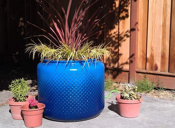 Цветочный горшок из барабана старой стиральной машины. Вполне симпатичный и вместительный, влаги не боится, прослужит долго, ведь металл — материал очень надёжный. Покрасить такой вазон для растений можно в любой цвет.