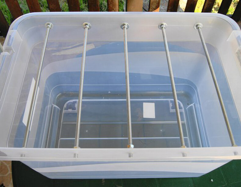 Приклеиваем скотч вдоль верхней части нашего ящика и делаем разметку под отверстия. Сверлим отверстия диаметром 9мм. Нарезаем штангу на 5 частей и устанавливаем в отверстия. Крепим при помощи гаек и шайб.