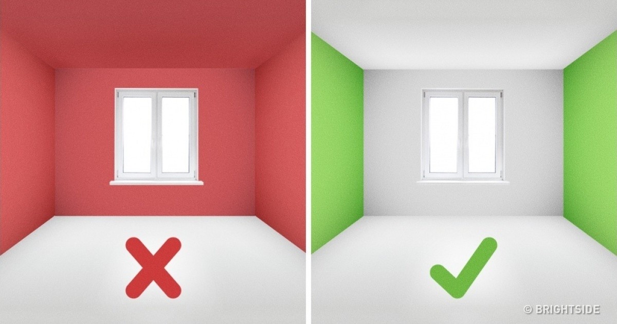Использование той же цветовой схемы для задней стены и потолка сделает комнату более широкой, но визуально уменьшает ее глубину.