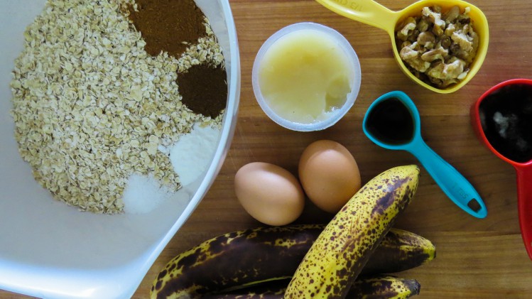 - В большой миске смешайте овсянку, специи, соль, разрыхлитель и орехи. Затем в небольшой миске тщательно перемешайте до однородной массы бананы, растительное масло, яйца, клиновый сироп и ваниль.