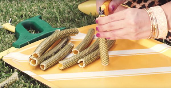 Разрежьте обручи и оденьте их на концы металлических кольев.